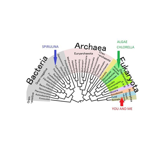 This means that algaes like chlorella are closer related to human beings than algaes are to spirulina.